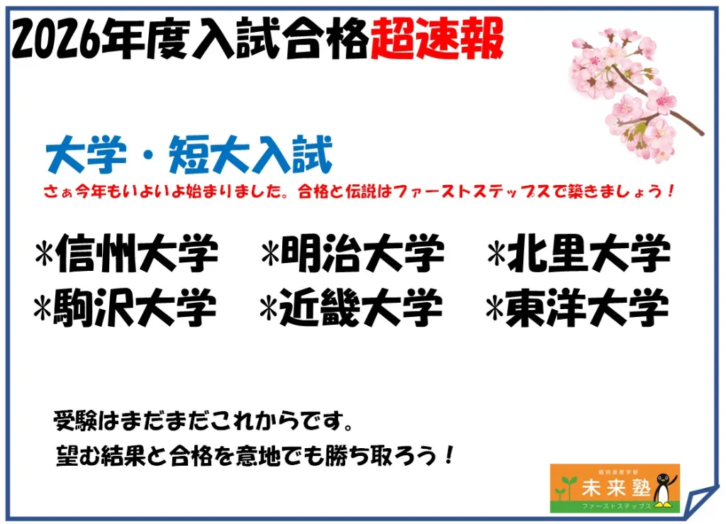 12月に入り、信州大学や北里大学など、大学の推薦入試(学校推薦型選抜)の合格速報が次々と届いています。